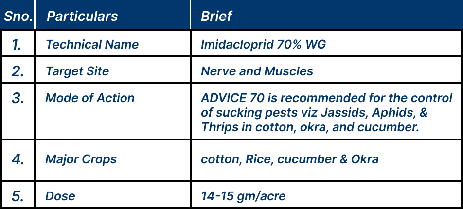 Sustainable agriculture is gaining increasing importance, farmers face the challenge of protecting their crops while minimizing the environmental impact. The agricultural industry demands effective solutions that strike a balance between productivity and ecological responsibility. "Advice 70" an innovative agricultural insecticide that aims to revolutionize the way we protect crops from pests. In this blog, we'll explore the features, benefits, and applications of Advice 70, and how it contributes to sustainable farming practices.