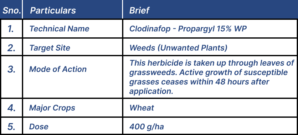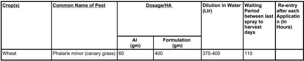 This herbicide is recommended for post-emergence application i.e. 30-35 days after sowing of wheat crop (when Phalaris minor is 3-4 leaf stage).